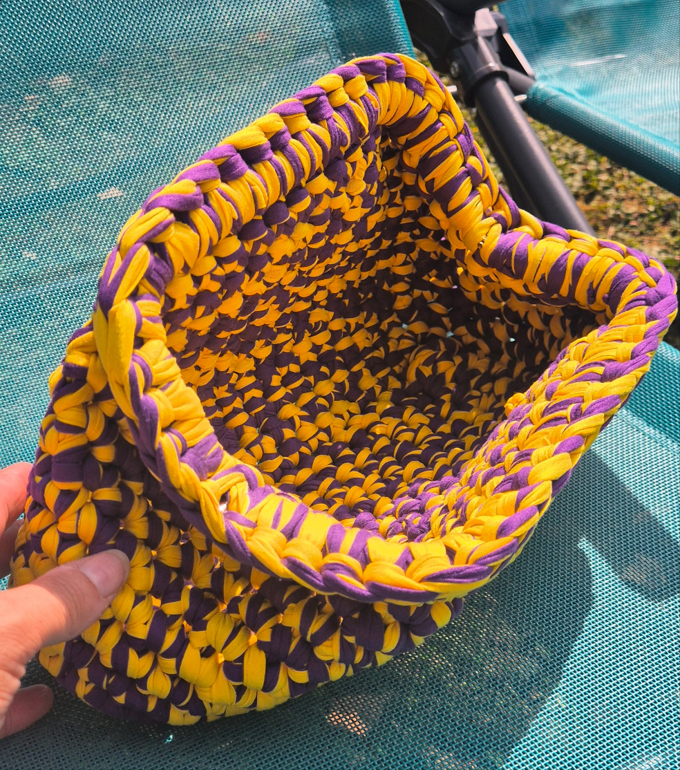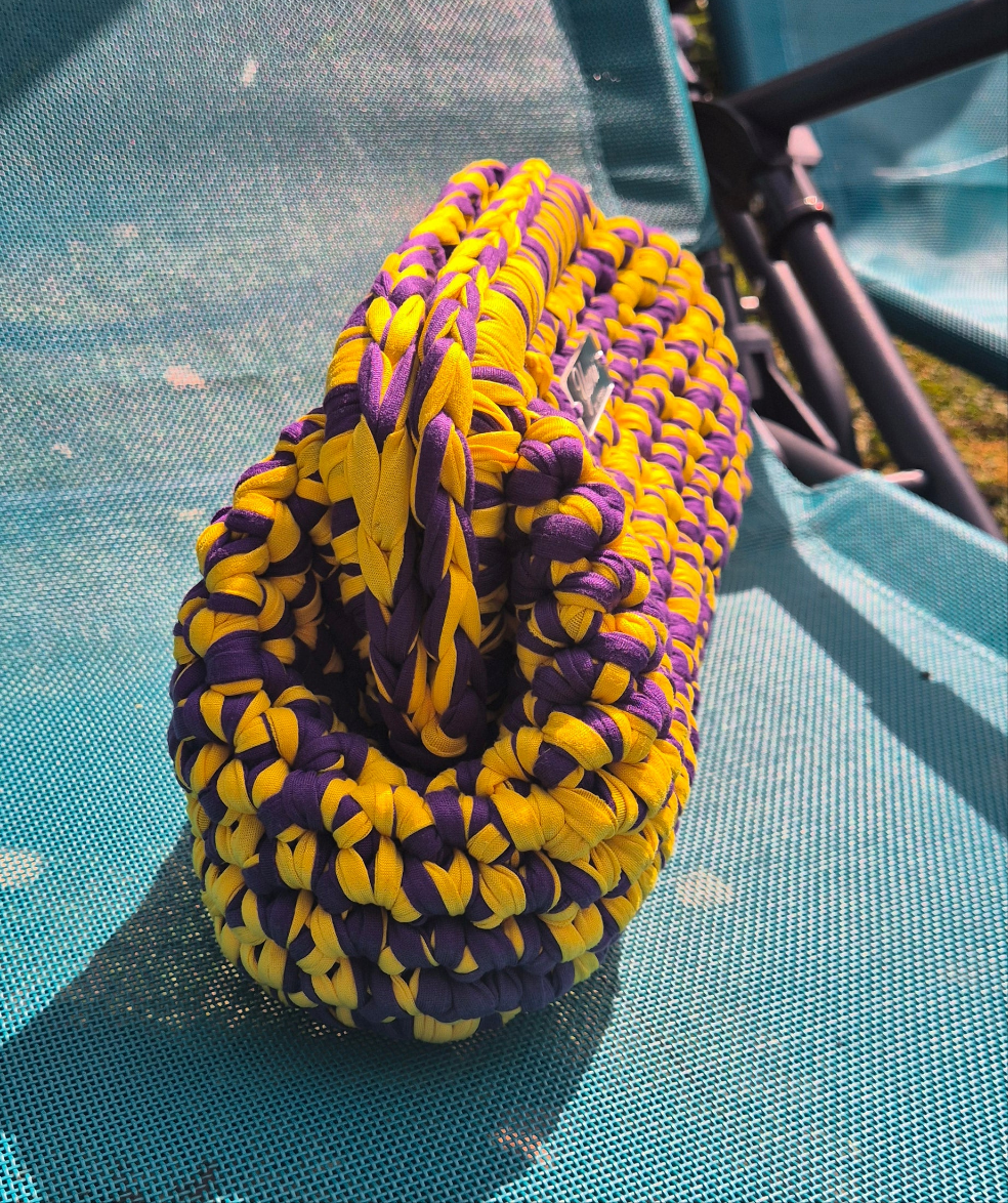 Son tressage artisanal en fils jaunes et violets évoque les couleurs vibrantes d’un coucher de soleil d’été.